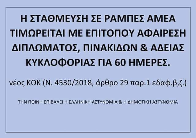 Η στάθμευση σε ράμπες ΑμεΑ τιμωρείται με επιτόπου αφαίρεση διπλώματος, πινακίδων και άδειας κυκλοφορίας για εξήντα ημέρες.